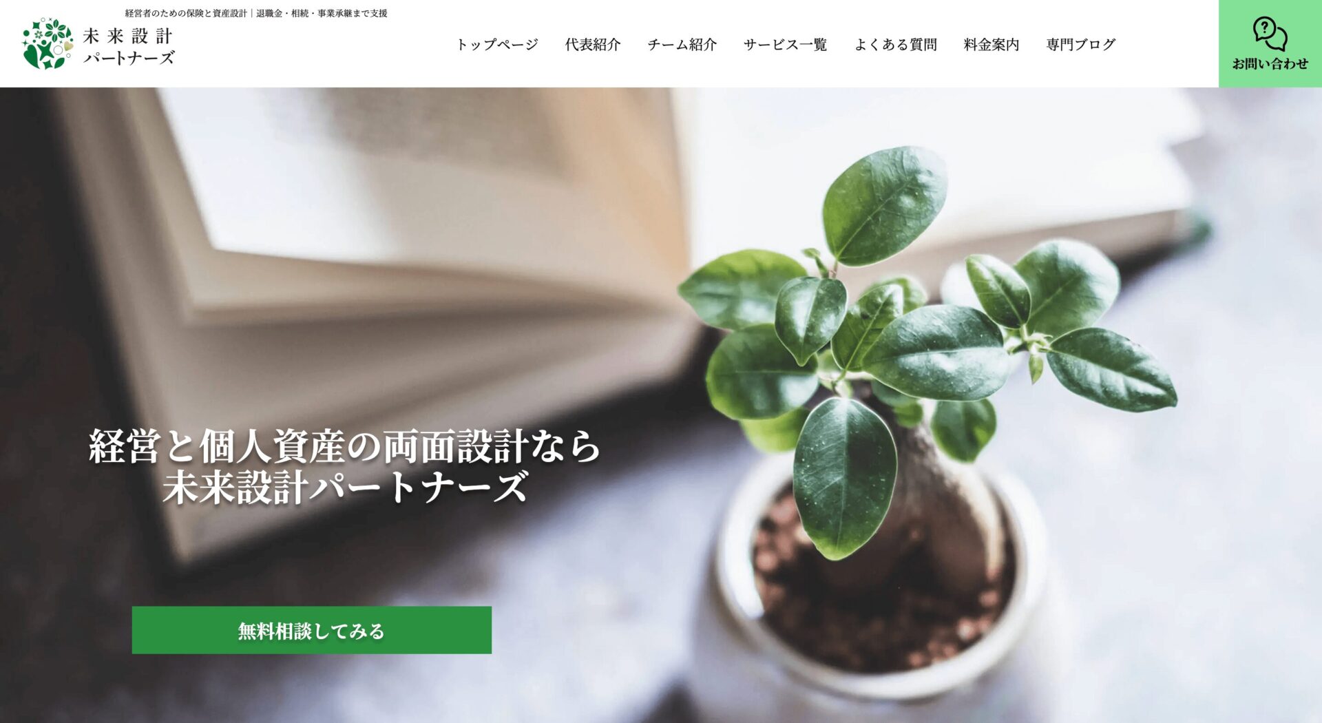 未来設計パートナーズでは、事業保障、労務リスク対策、退職金設計、保険・資産形成、相続・事業承継まで扱い、中立的な視点で分析して提案する姿勢を掲げています。